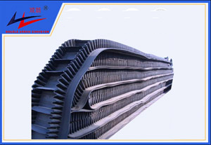 大傾角波狀擋邊輸送帶又叫裙邊隔板輸送帶,是由基帶、擋邊、橫隔板3部分組成。擋邊起防止物料側滑撒落的作用。為便于繞過滾筒,擋邊設計成波紋狀,橫隔板的作用是承托物料,為實現大傾角輸送,采用T型TC型。本公司生產的波狀擋邊輸送帶擋邊和橫隔板是用二次硫化的方法與基帶連接的,具有很高的連接強度。